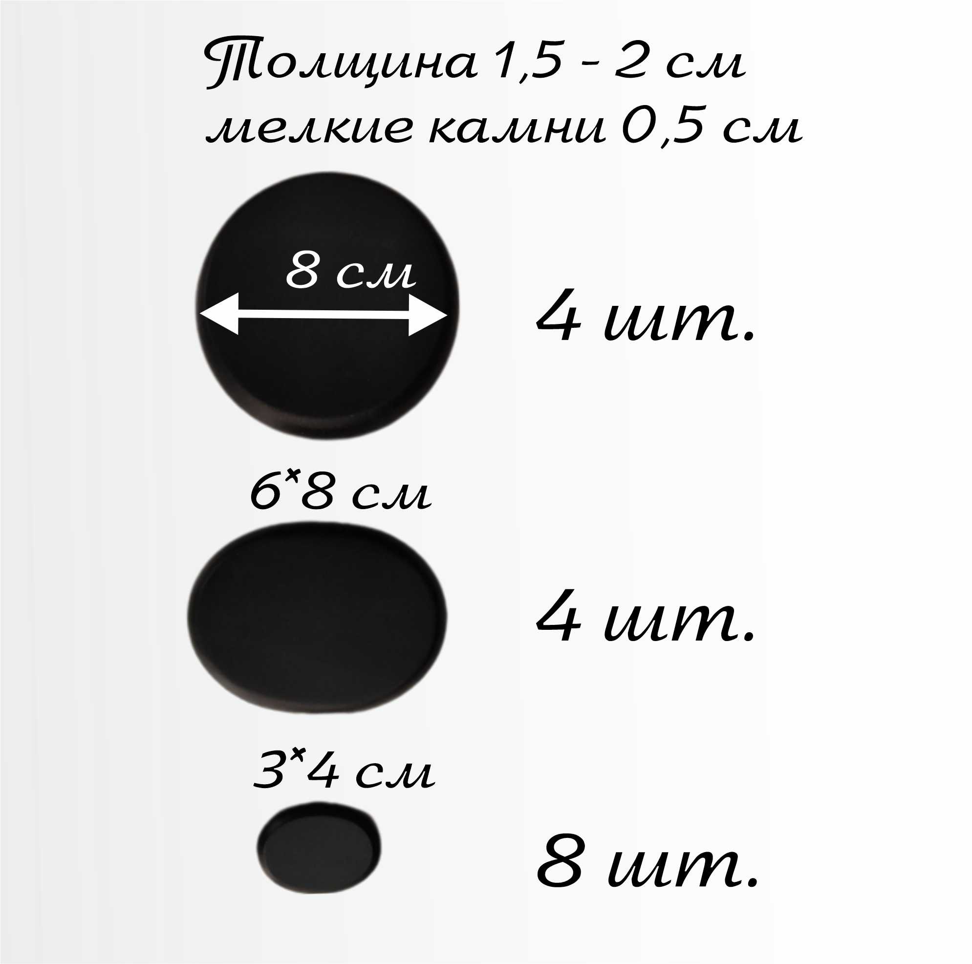 В наборе 16 штук: 4 шт. - круглые 8 см., 4 шт. - овальные 6 * 8 см. Толщина камней 1,5-2 см. 8 штук - овальные 3 * 4 см. Толщина камней до 5 мм.