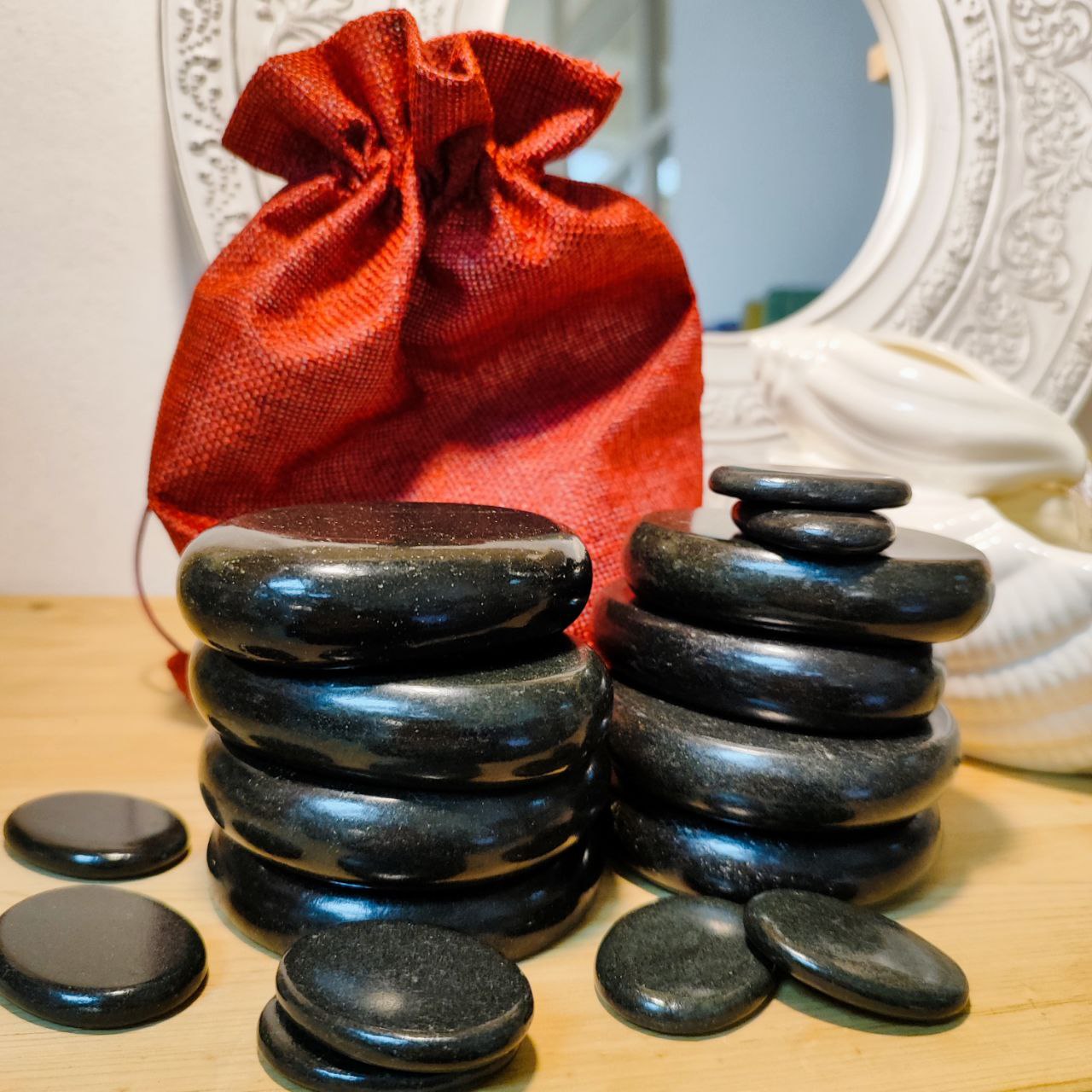 Камни помещены в удобный мешочек, что упрощает хранение и транспортировку. Вы можете брать с собой эти чудесные инструменты для массажа на отдых или использовать их в процессе проведения разнообразных спа-процедур.
