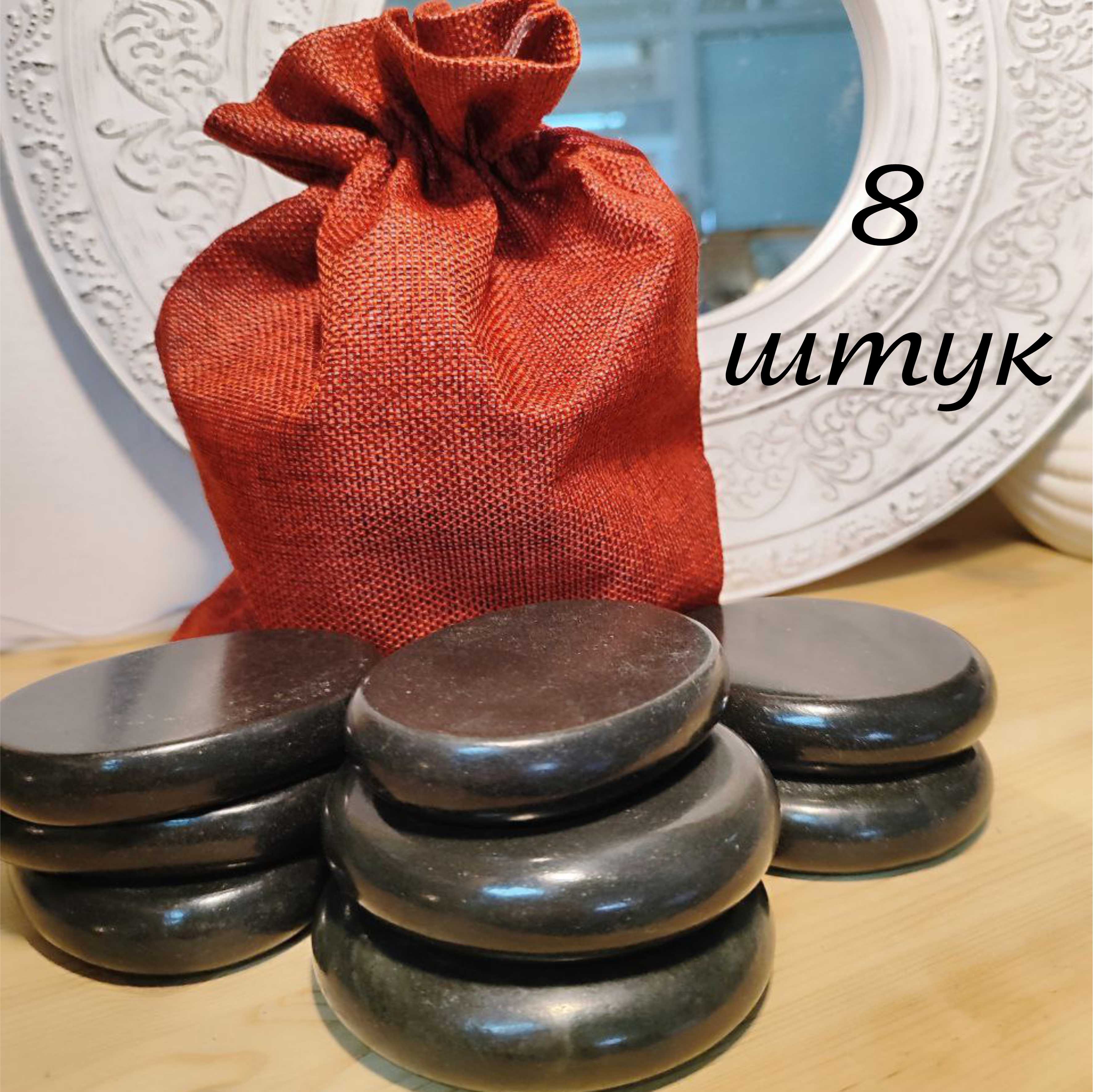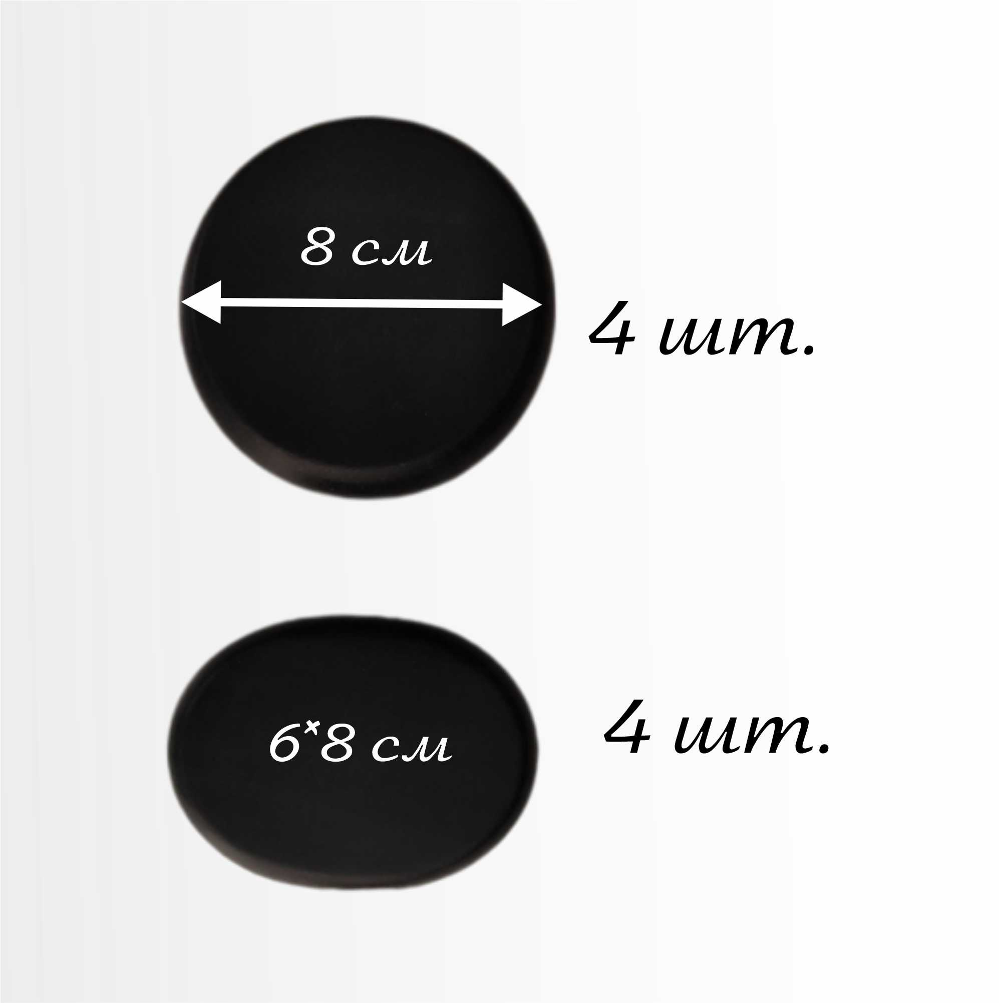 В наборе 8 штук: 4 шт. - круглые 8 см., 4 шт. - овальные 6 * 8 см. Толщина камней 1,5-2 см.