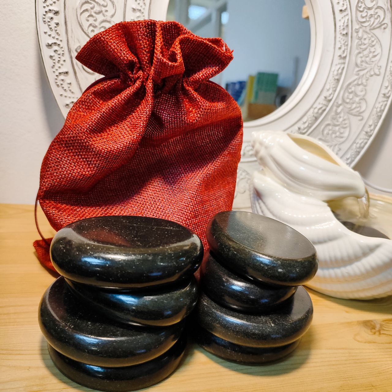 Камни помещены в удобный мешочек, что упрощает хранение и транспортировку. Вы можете брать с собой эти чудесные инструменты для массажа на отдых или использовать их в процессе проведения разнообразных спа-процедур.