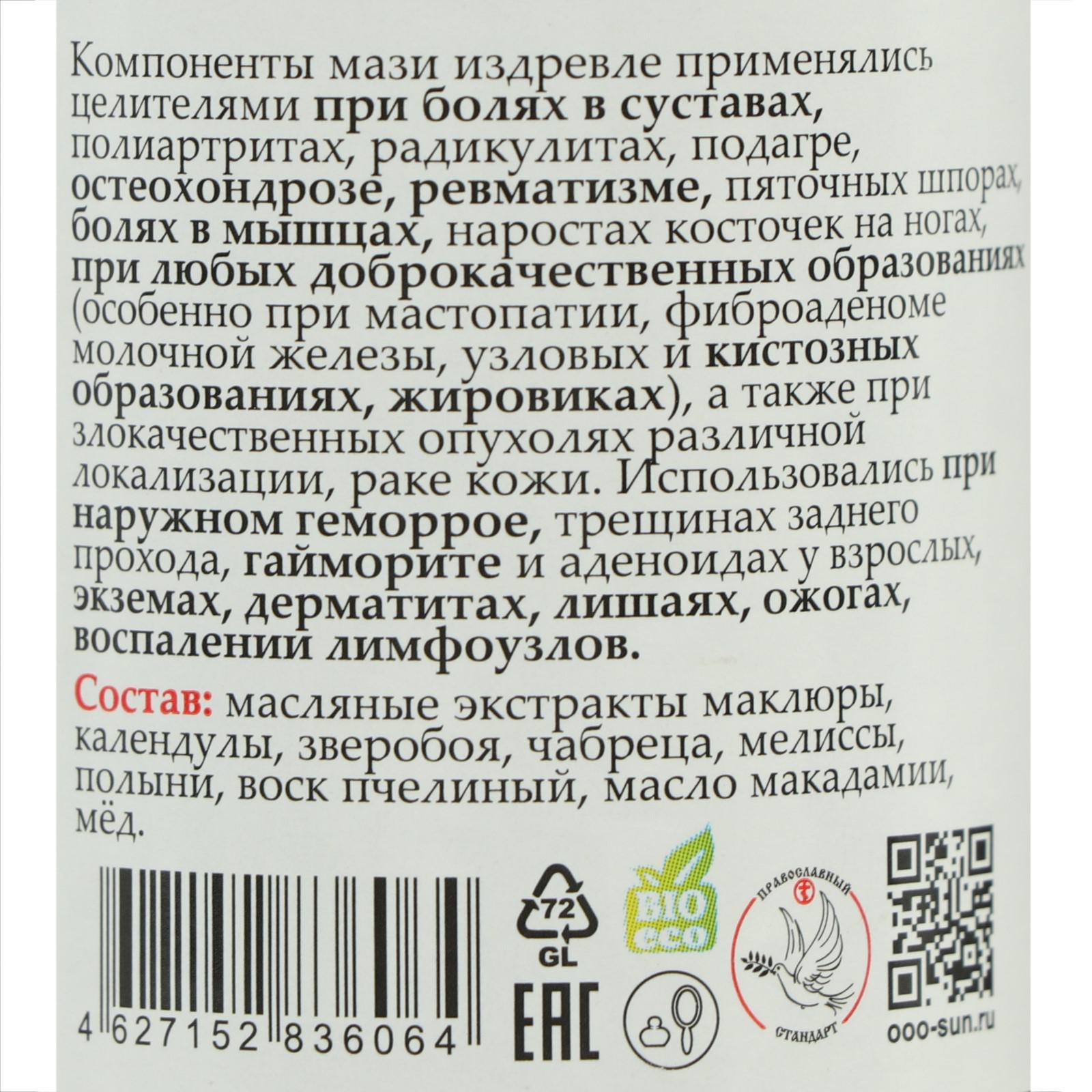 Состав: воск пчелиный, мед натуральный кавказский, масляный экстракт маклюры, млечный сок маклюры, масляные экстракты календулы, зверобоя, чабреца, мелиссы.