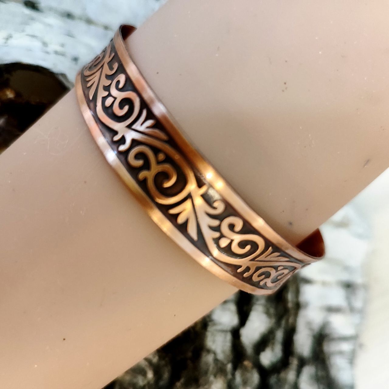 На браслете изображен растительный орнамент - залог богатого урожая, сытости, успеха, новых начинаний. С давних времен медь использовали как лекарство. Пластинами меди заживляли раны, синяки, ушибы, лечили, головные, неврологические боли. Медь так же улучшает сон, влияет на тонус организма. Современные исследования показали что при анемии, ношение обычной медной пластины, восстанавливает форму неправильных эритроцитов. Медные браслеты носят при артритах и повышенном давлении. Вогнутая форма браслета обеспечивает плотное прилегание к коже.